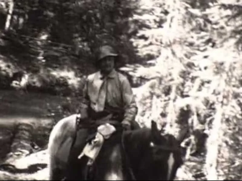 This 16mm film was shot circa 1934 on a trip to the west and north, using equipment owned by Raymond Sprague I. This clip shows traial riding and camps, and names Canadian locations that include the Athabaska Valley, Medicine Lake /Jacques Lake Trail, Maligne/Bald Mountains, and Shovel Pass.